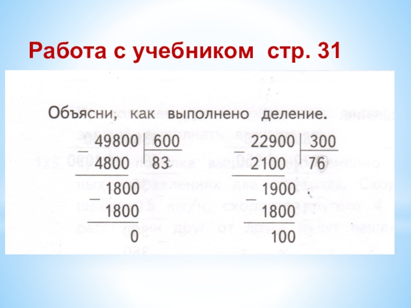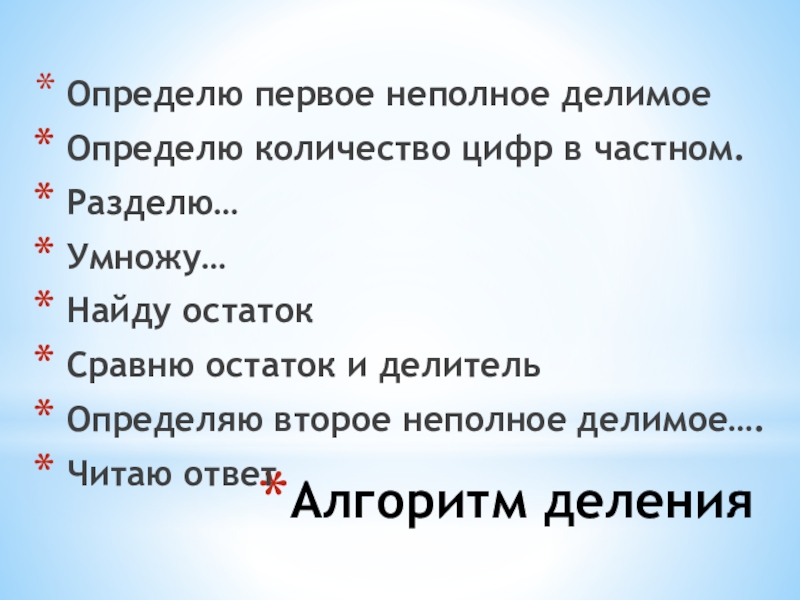 Алгоритм деления Определю первое неполное делимое Определю количество цифр в частном. Разделю… Умножу… Найду остаток Сравню остаток