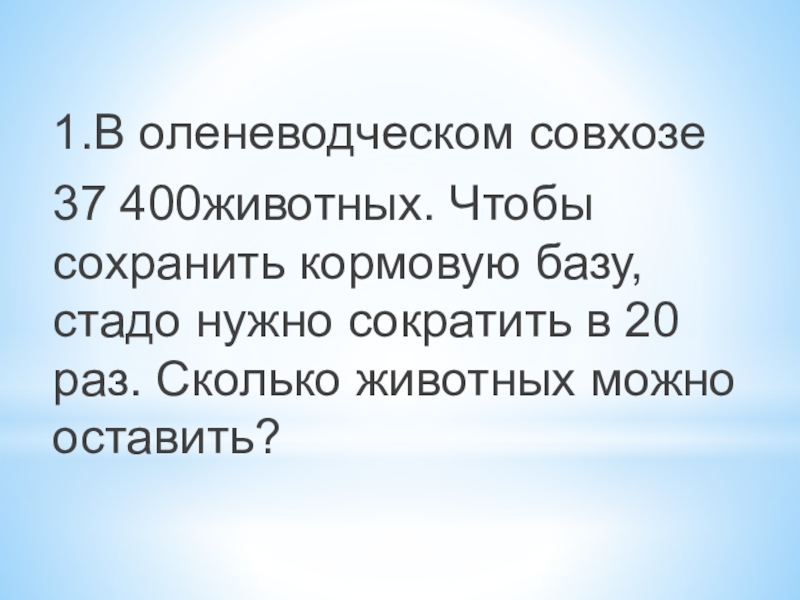 1.В оленеводческом совхозе 37 400животных. Чтобы сохранить кормовую базу, стадо нужно сократить в 20 раз. Сколько животных