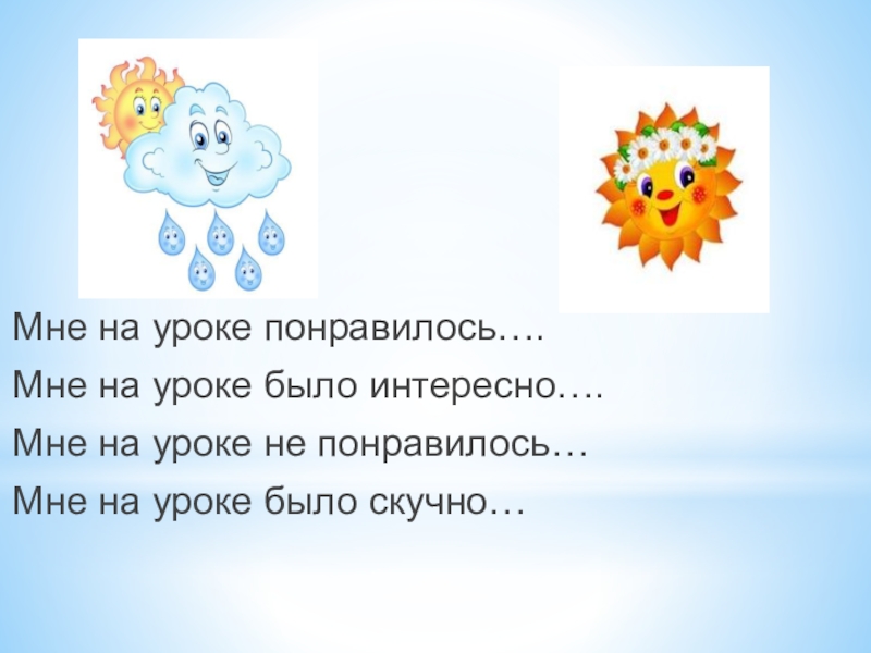 Мне на уроке понравилось….Мне на уроке было интересно….Мне на уроке не понравилось…Мне на уроке было скучно…