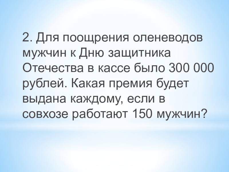2. Для поощрения оленеводов мужчин к Дню защитника Отечества в кассе было 300 000 рублей. Какая премия