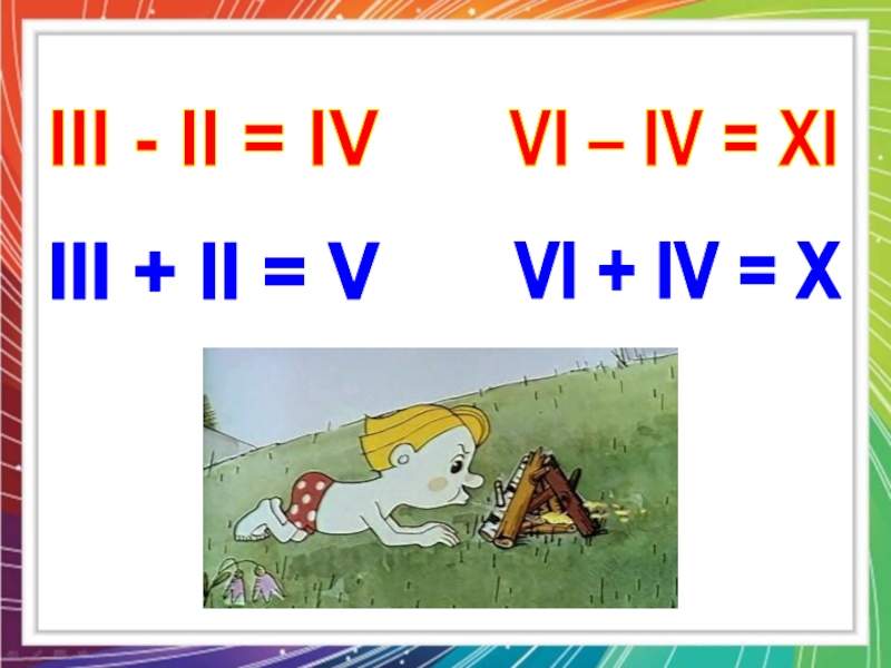 III - II = IVVI – IV = XIVI + IV = XIII + II = V