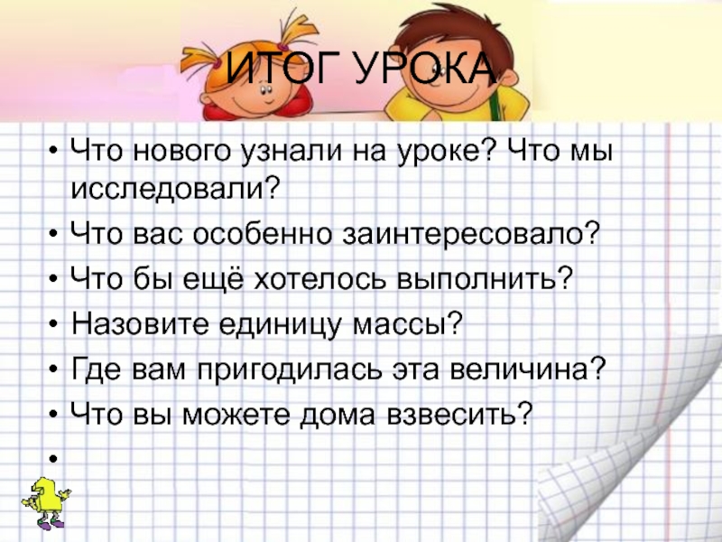 ИТОГ УРОКАЧто нового узнали на уроке? Что мы исследовали?Что вас особенно заинтересовало? Что бы ещё хотелось выполнить?Назовите