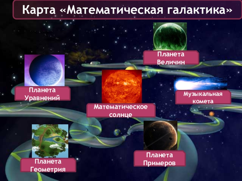 Карта «Математическая галактика»Планета УравненийПланета Примеров Планета Величин Планета Геометрия  Математическое солнце  Музыкальная комета