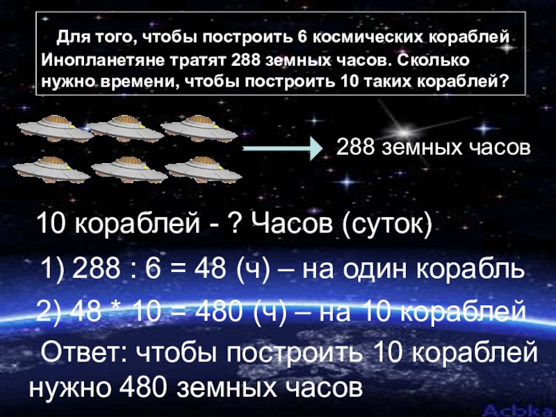 1) 288 : 6 = 48 (ч) – на один корабль