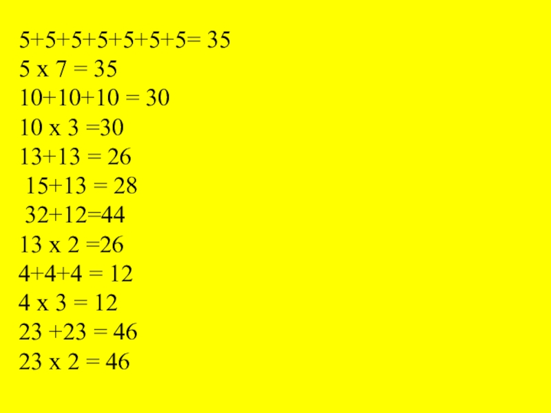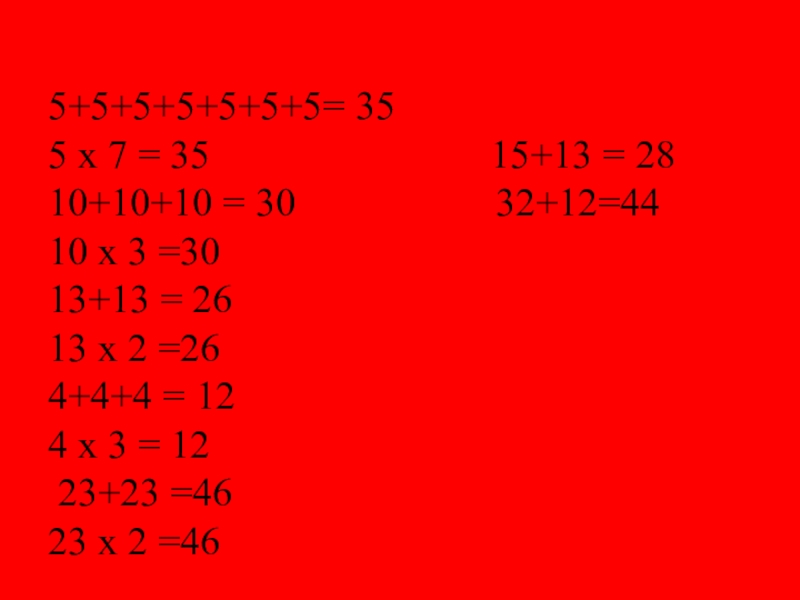 Слайд 13 5+5+5+5+5+5+5= 35 5 х 7 = 35