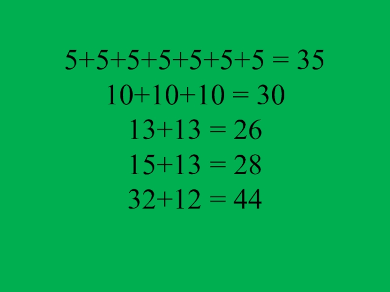 Слайд 115+5+5+5+5+5+5 = 35 10+10+10 = 30 13+13 = 26 15+13 = 28 32+12 = 44