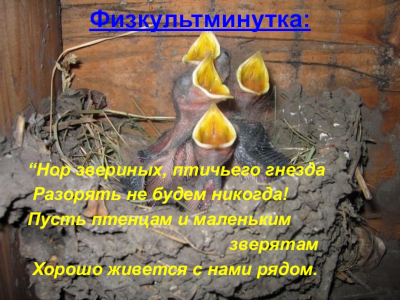 Физкультминутка:“Нор звериных, птичьего гнезда Разорять не будем никогда!Пусть птенцам и маленьким