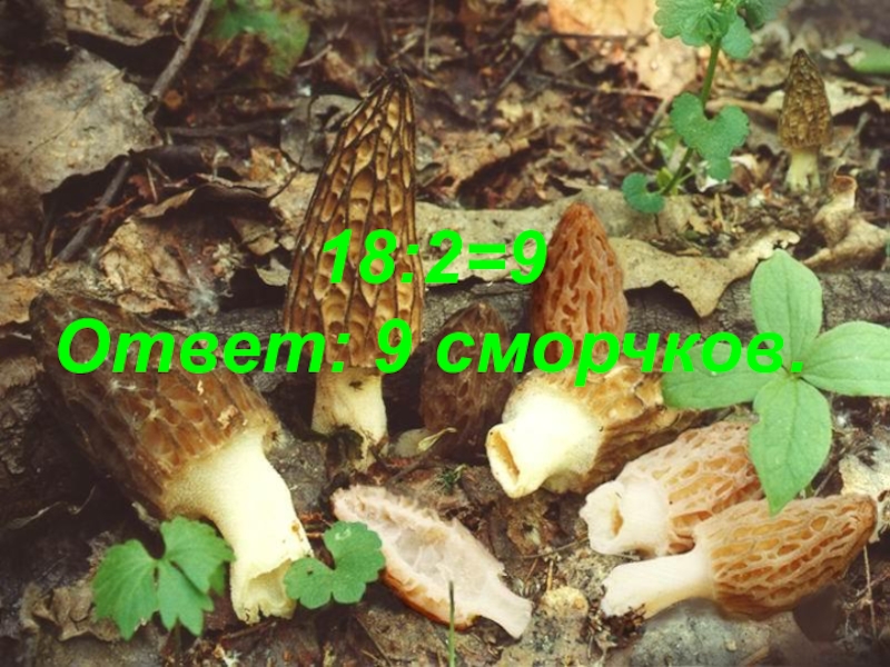 Слайд 2418:2=9 Ответ: 9 сморчков.