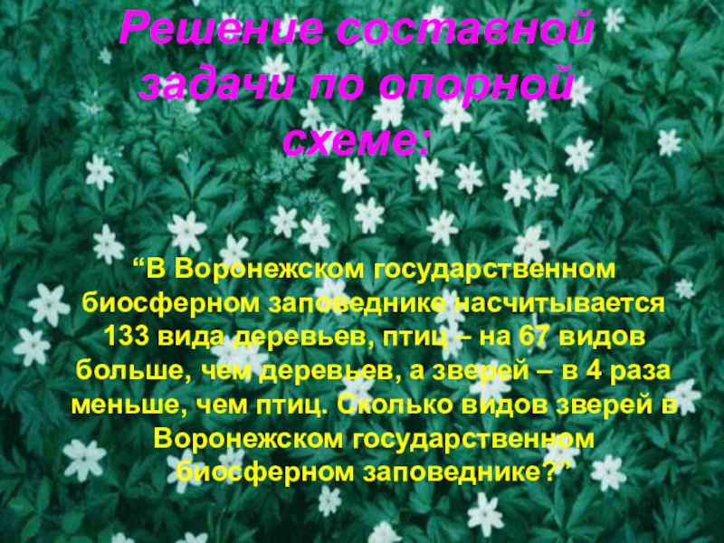 Решение составной задачи по опорной схеме: “В Воронежском государственном биосферном заповеднике насчитывается 133 вида деревьев, птиц –