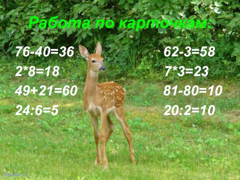 Работа по карточкам: 76-40=36            62-3=58 2*8=18