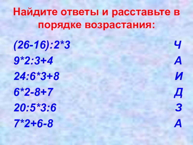 Найдите ответы и расставьте в порядке возрастания: (26-16):2*3