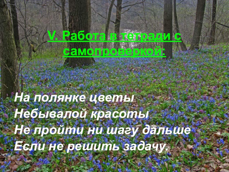 V. Работа в тетради с самопроверкой:На полянке цветыНебывалой красотыНе пройти ни шагу дальшеЕсли не решить задачу.