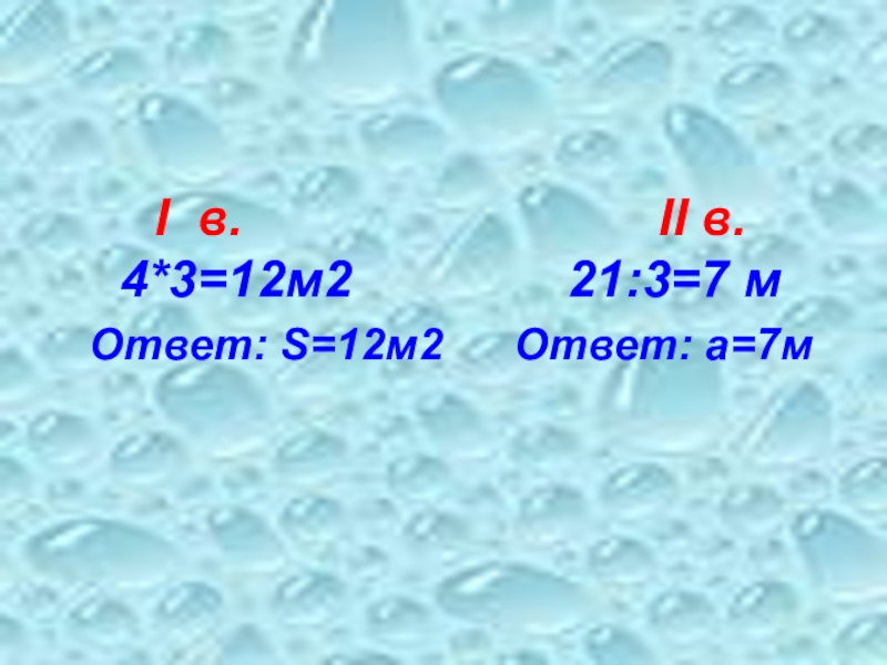 II в. 4*3=12м2 21:3=7 м Ответ: S=12м2 Ответ: а=7м