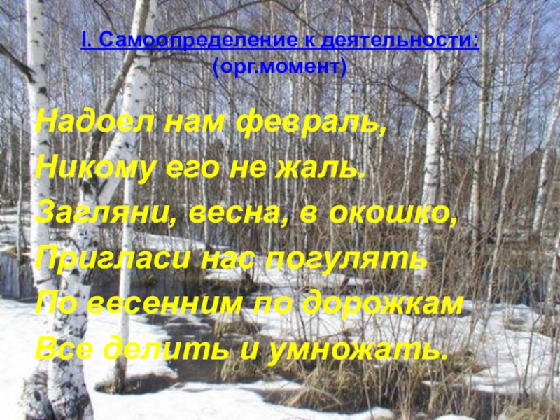 I. Самоопределение к деятельности: (орг.момент)Надоел нам февраль,Никому его не жаль.Загляни, весна, в окошко,Пригласи нас погулятьПо весенним по дорожкамВсе делить и умножать.