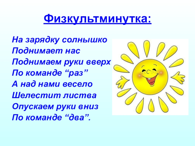 Физкультминутка: На зарядку солнышкоПоднимает насПоднимаем руки вверхПо команде “раз”А над нами веселоШелестит листваОпускаем руки внизПо команде “два”.
