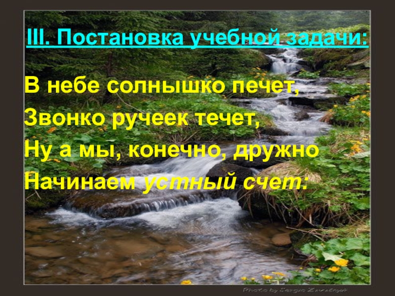 III. Постановка учебной задачи: В небе солнышко печет, Звонко ручеек течет,Ну а мы, конечно, дружноНачинаем устный счет: