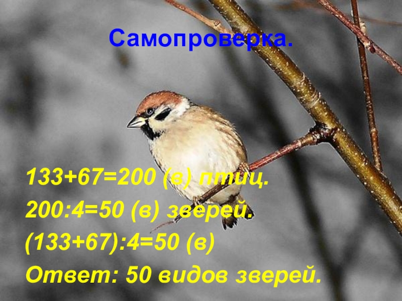 Самопроверка.133+67=200 (в) птиц.200:4=50 (в) зверей.(133+67):4=50 (в)Ответ: 50 видов зверей.