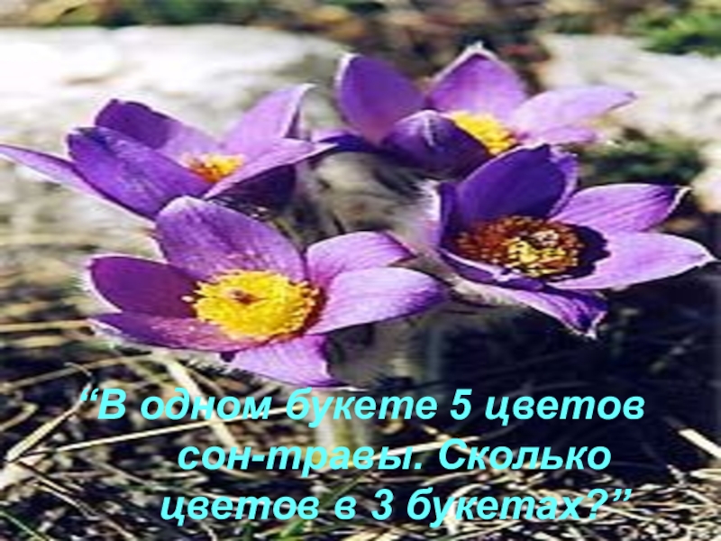 Слайд 19“В одном букете 5 цветов сон-травы. Сколько цветов в 3 букетах?”