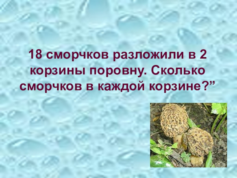 Слайд 2318 сморчков разложили в 2 корзины поровну. Сколько сморчков в каждой