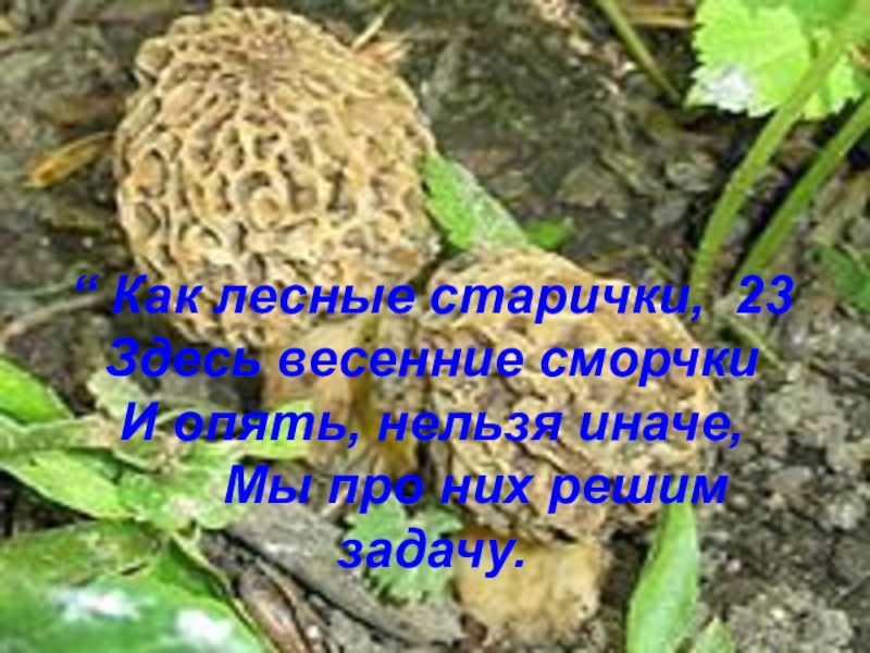 Слайд 22“ Как лесные старички, 23 Здесь весенние сморчки И опять, нельзя иначе,
