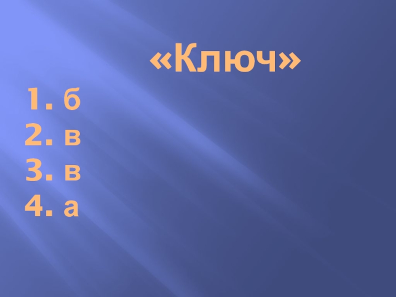 Слайд 14 «Ключ» 1. б 2. в 3. в 4.