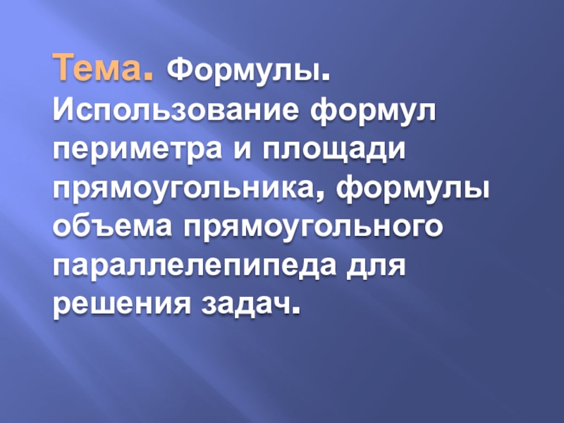 Слайд 2Тема. Формулы. Использование формул периметра и площади прямоугольника, формулы объема прямоугольного