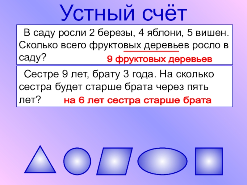 Сестре 9 лет, брату 3 года. На сколько сестра будет старше брата через пять лет?