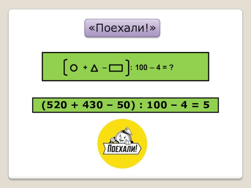 «Поехали!»(520 + 430 – 50) : 100 – 4 = 5