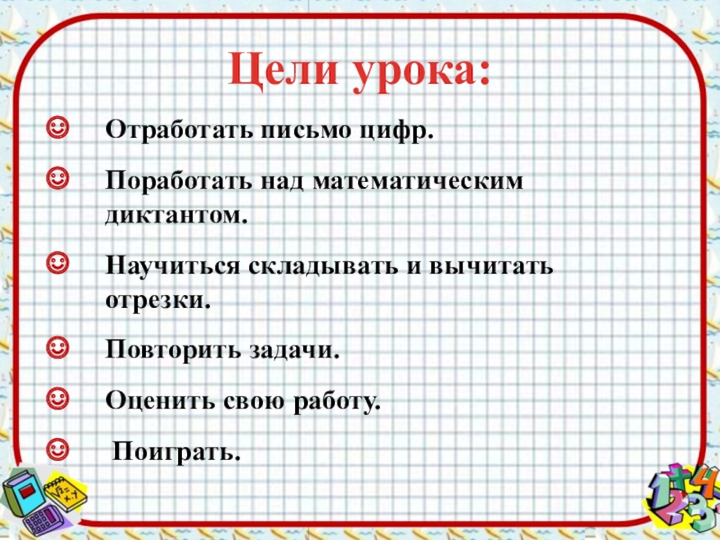 Цели урока:Отработать письмо цифр.Поработать над математическим диктантом.Научиться складывать и вычитать отрезки.Повторить задачи.Оценить свою работу. Поиграть.