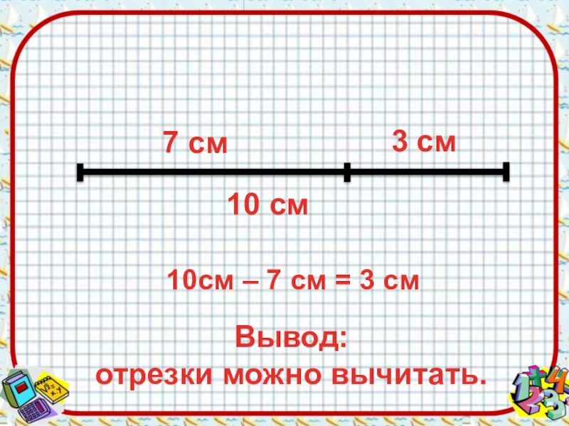 10см – 7 см = 3 см  10 см3 см7 смВывод: отрезки можно вычитать.