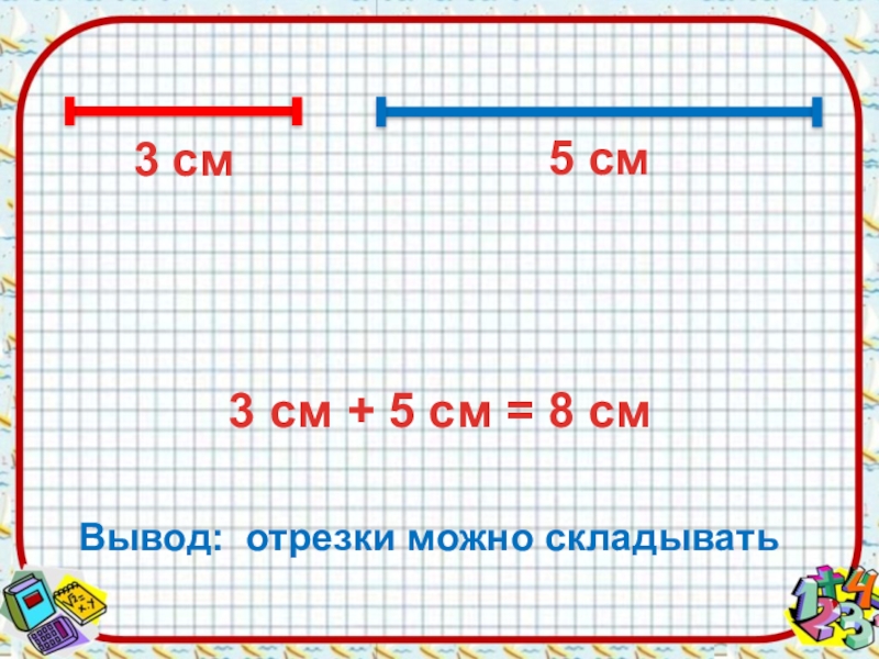 3 см + 5 см = 8 смВывод: отрезки можно складывать3 см5 см
