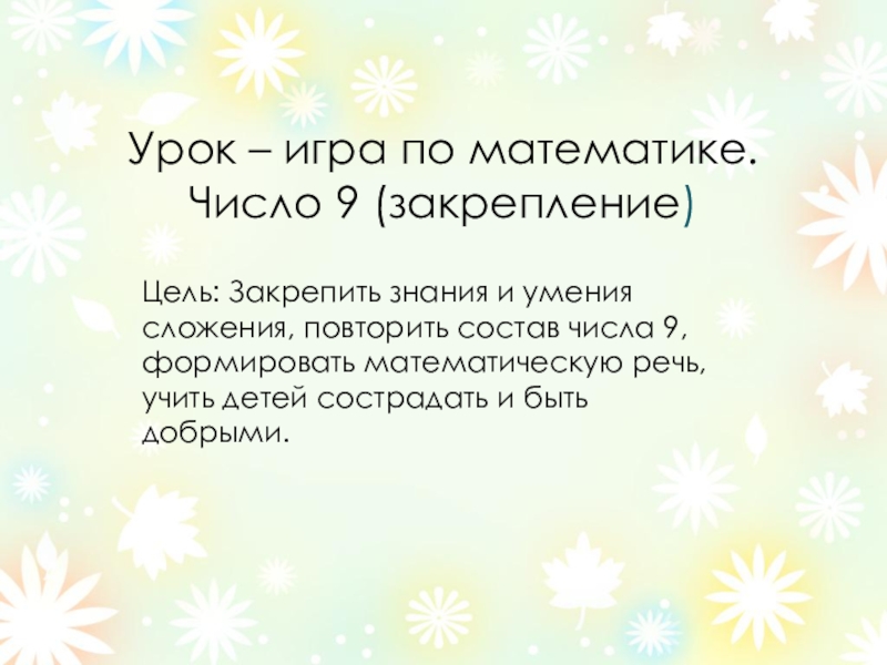 сложения, повторить состав числа 9, формировать математическую речь, учить детей сострадать и быть добрыми.