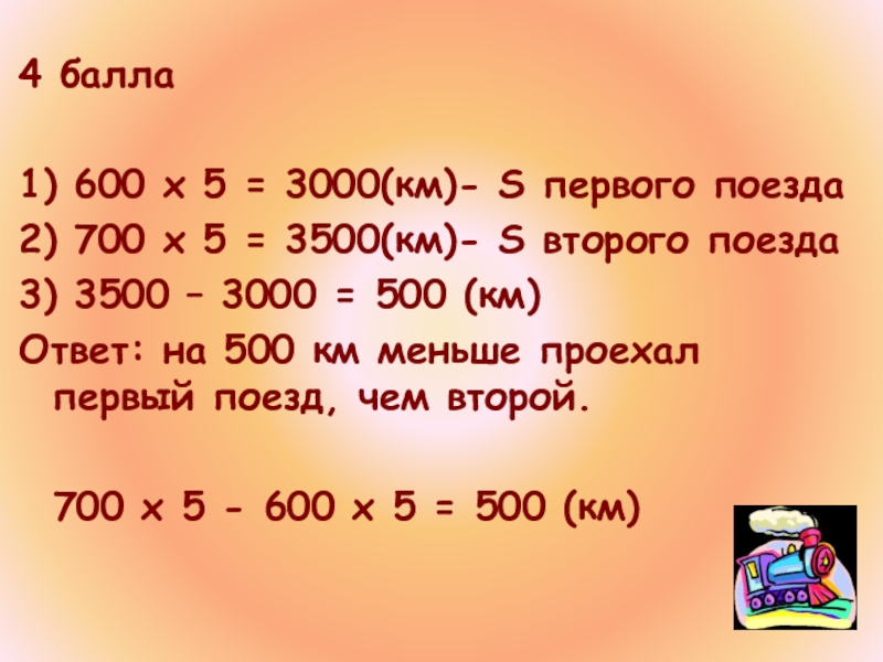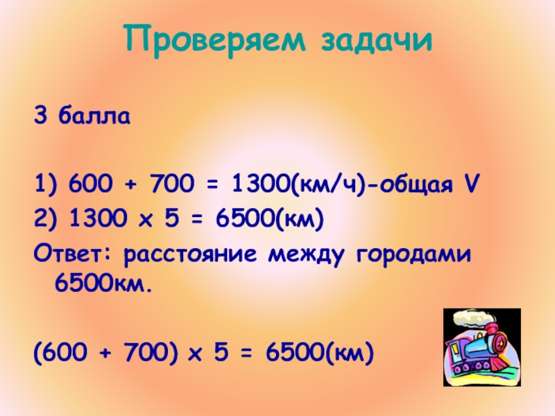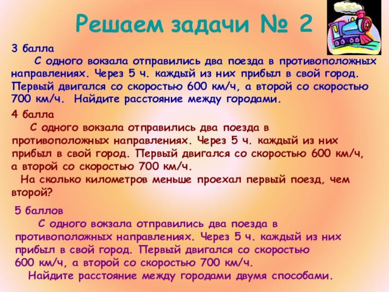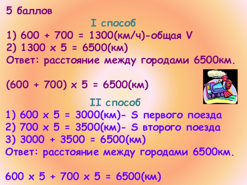 С одного вокзала отправились два поезда в противоположных направлениях. Через 5 ч. каждый из них прибыл в свой город. Первый двигался со скоростью 600 км/ч, а второй со скоростью 700 км/ч.