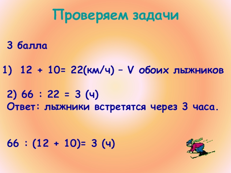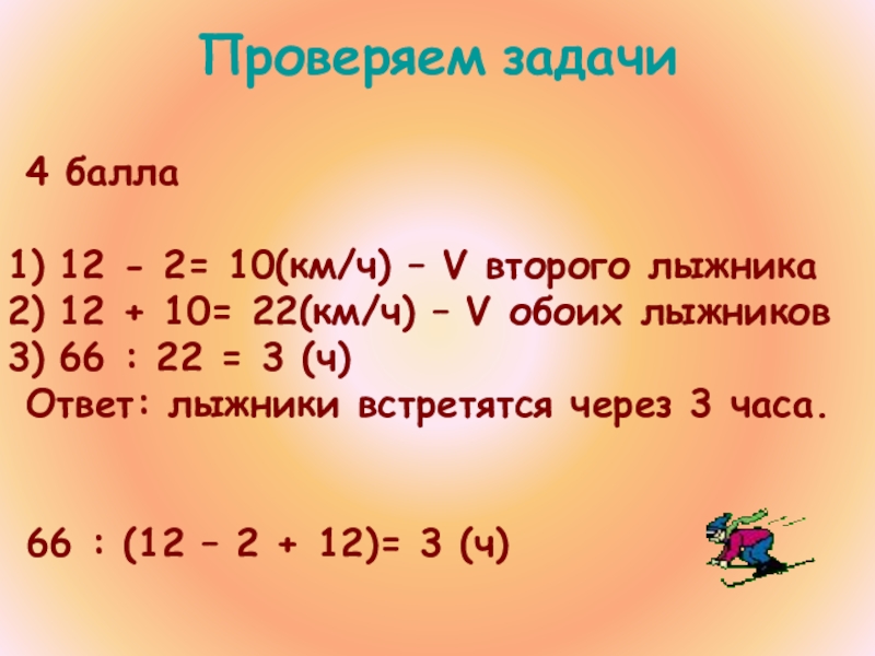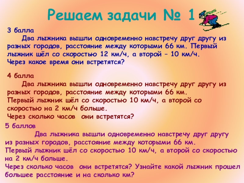 Два лыжника вышли одновременно навстречу друг другу из разных городов, расстояние между которыми 66 км.