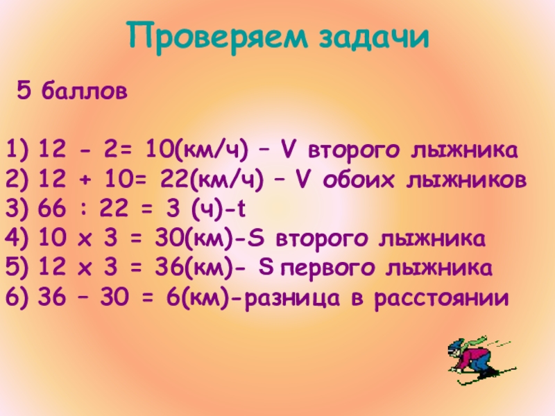 Первый лыжник шёл со скоростью 10 км/ч, а второй со скоростью на 2 км/ч больше.