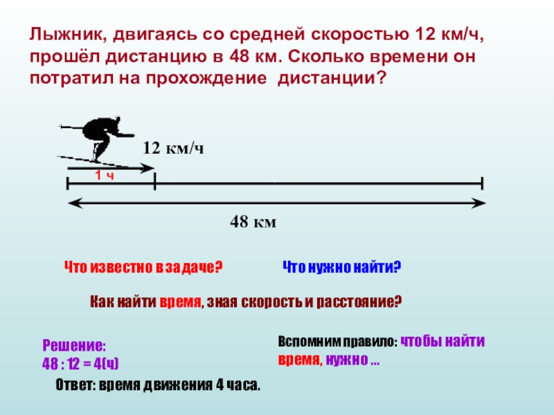 Решение: 12 х 4 = 48(км) – протяженность дистанции.