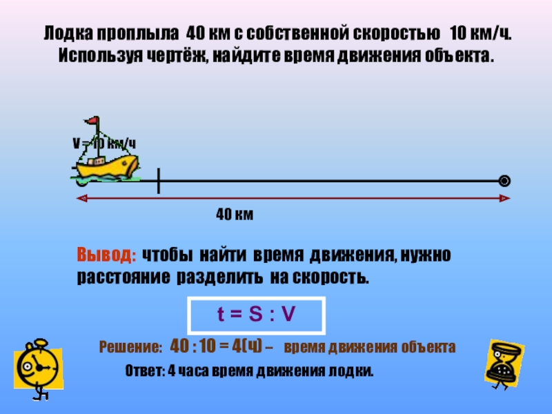 Решение: 40 : 10 = 4(ч) – время движения объекта