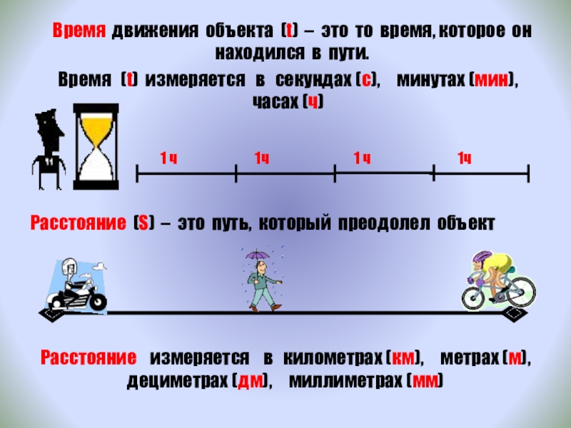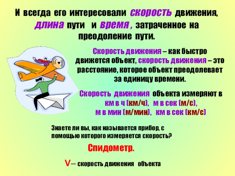 Скорость движения объекта измеряют в км в ч (км/ч), м в сек (м/с), м в мин (м/мин), км в сек (км/с)