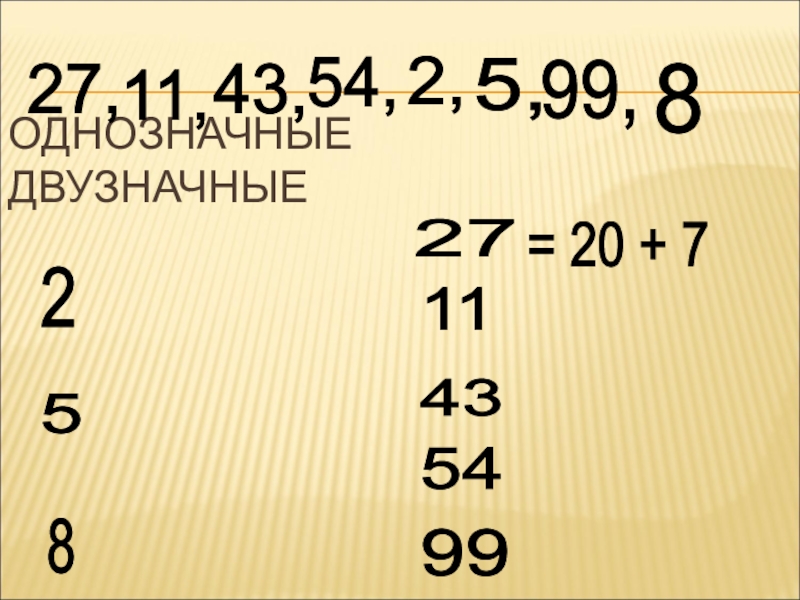 ОДНОЗНАЧНЫЕ    ДВУЗНАЧНЫЕ2 5 8 99 11 43 54 27 = 20 + 7 99,