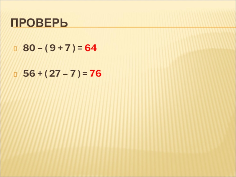 ПРОВЕРЬ80 – ( 9 + 7 ) = 6456 + ( 27 – 7 ) = 76