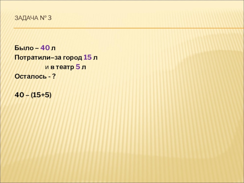 ЗАДАЧА № 3Было – 40 лПотратили–за город 15 л