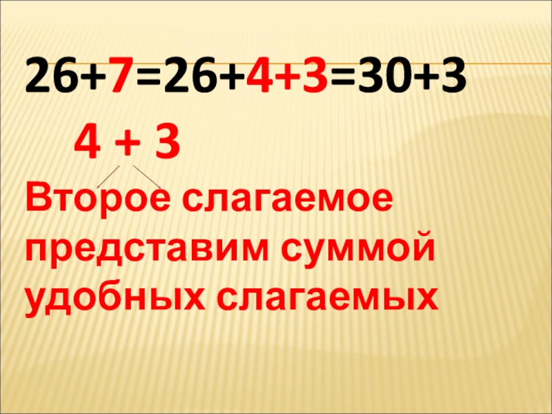 26+7=26+4+3=30+3  4 + 3Второе слагаемое представим суммой удобных слагаемых