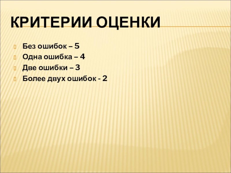 КРИТЕРИИ ОЦЕНКИБез ошибок – 5Одна ошибка – 4Две ошибки – 3Более двух ошибок - 2