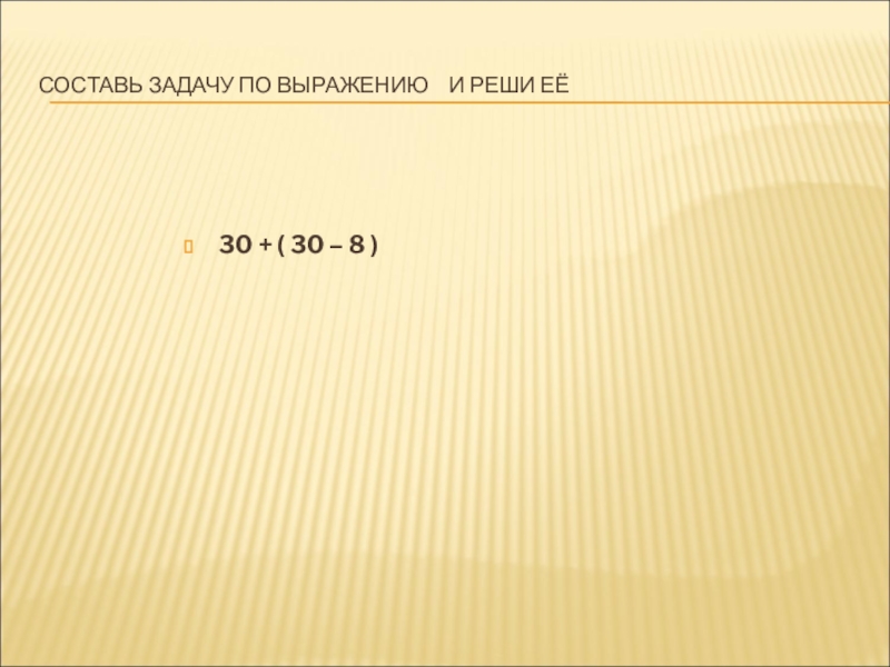 СОСТАВЬ ЗАДАЧУ ПО ВЫРАЖЕНИЮ  И РЕШИ ЕЁ30 + ( 30 – 8 )