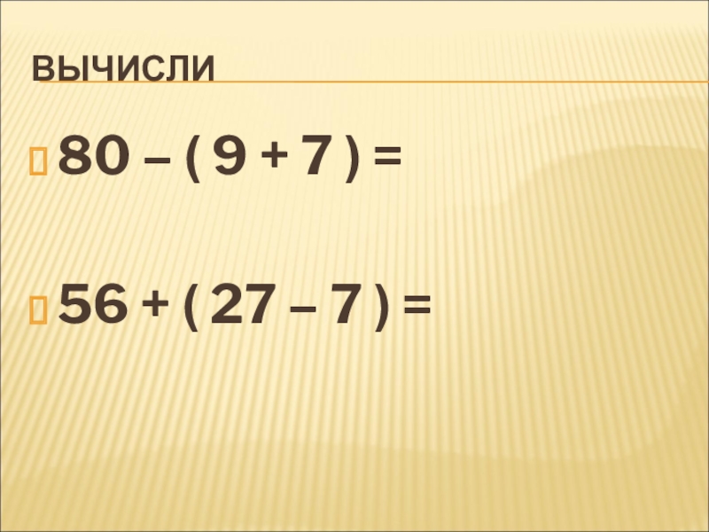 ВЫЧИСЛИ80 – ( 9 + 7 ) = 56 + ( 27 – 7 ) =