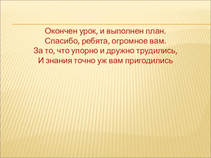 Окончен урок, и выполнен план.Спасибо, ребята, огромное вам.За то, что упорно и дружно трудились,И знания точно уж