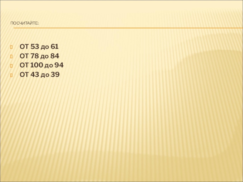 ПОСЧИТАЙТЕ:ОТ 53 до 61ОТ 78 до 84ОТ 100 до 94ОТ 43 до 39