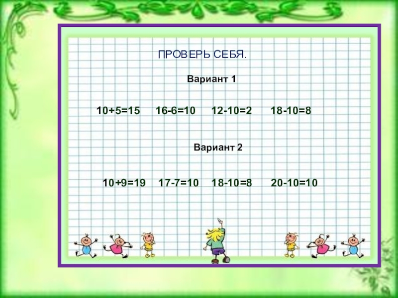 ПРОВЕРЬ СЕБЯ.10+5=15   16-6=10   12-10=2   18-10=8Вариант 1Вариант 210+9=19  17-7=10  18-10=8