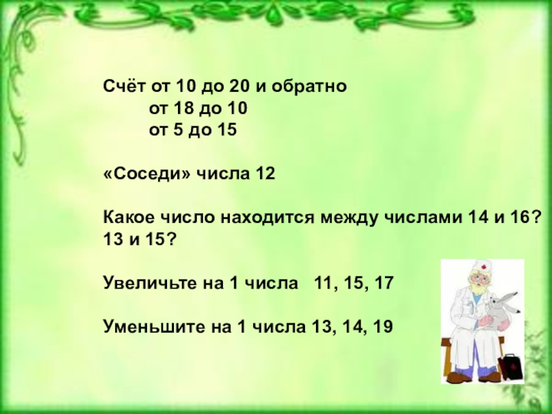 Счёт от 10 до 20 и обратно от 18 до 10 от 5 до 15«Соседи» числа 12Какое число находится между числами 14 и 16?13 и 15?Увеличьте на 1