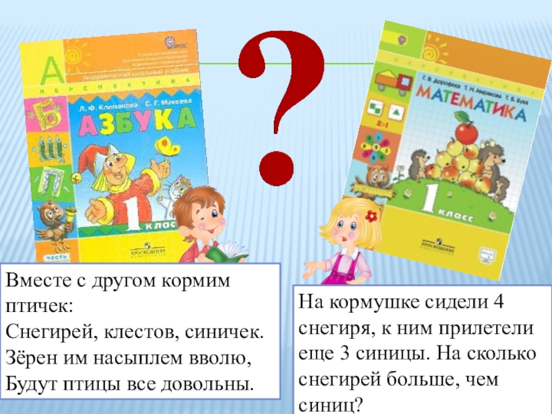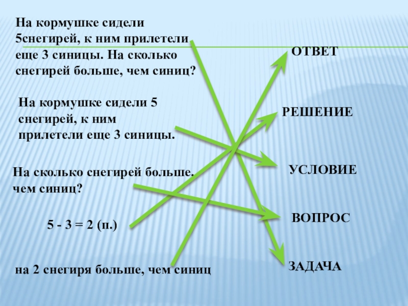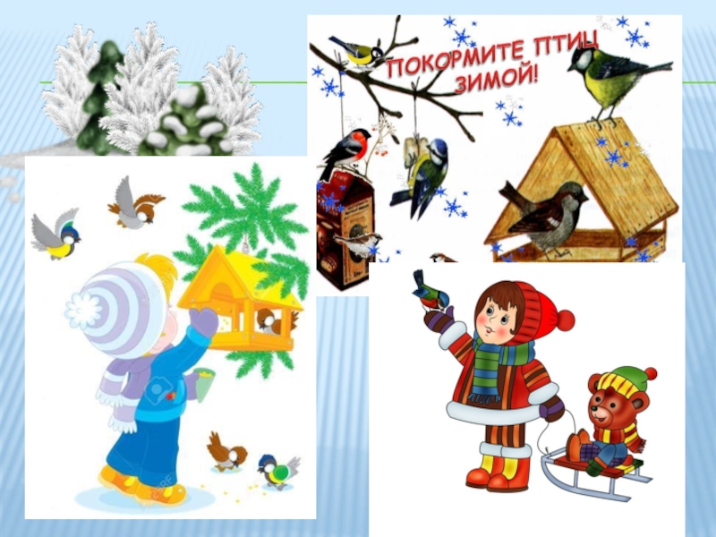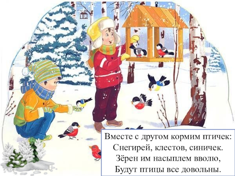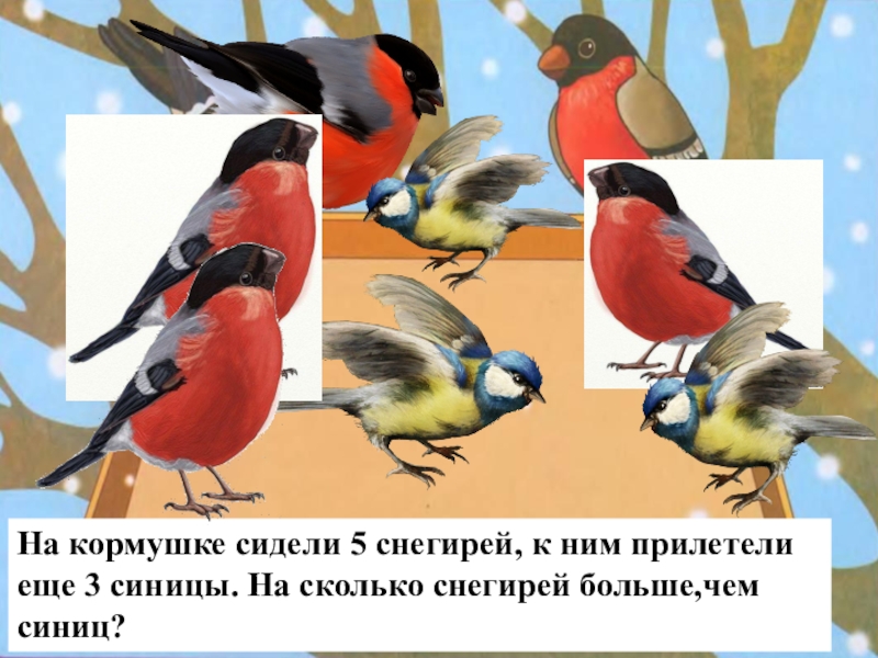 На кормушке сидели 5 снегирей, к ним прилетели еще 3 синицы.